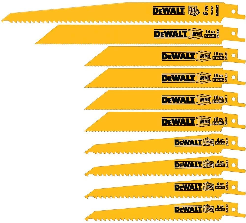 Best Budget: DEWALT Reciprocating Saw Blades, Bi-Metal Set with Case, 10-Piece (DW4898) , Yellow