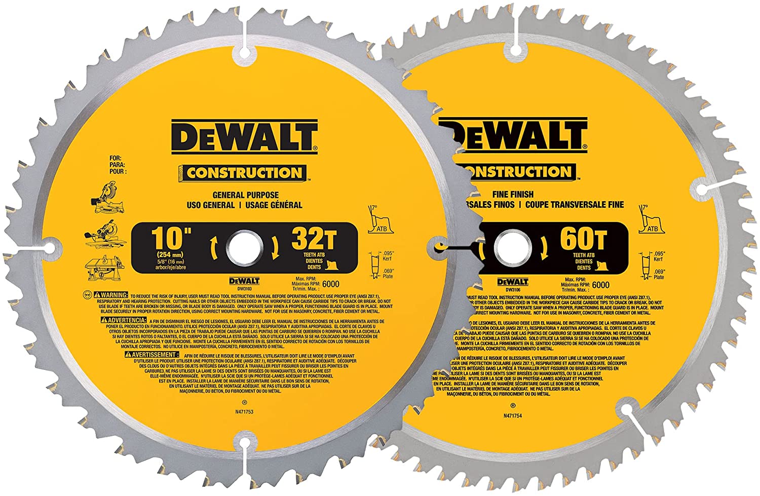 Best Budget: DEWALT 10-Inch Miter / Table Saw Blades, 60-Tooth Crosscutting & 32-Tooth General Purpose, Combo Pack (DW3106P5)